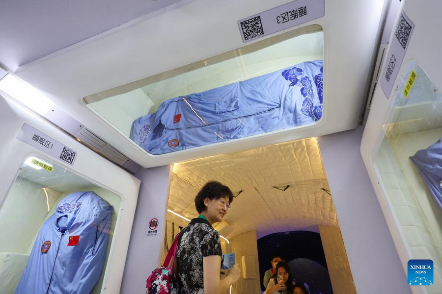 Besucher im Schlafbereich der Wentian-Laborkapsel-Nachbildung. (Foto: Liu Dawei/Xinhua)
