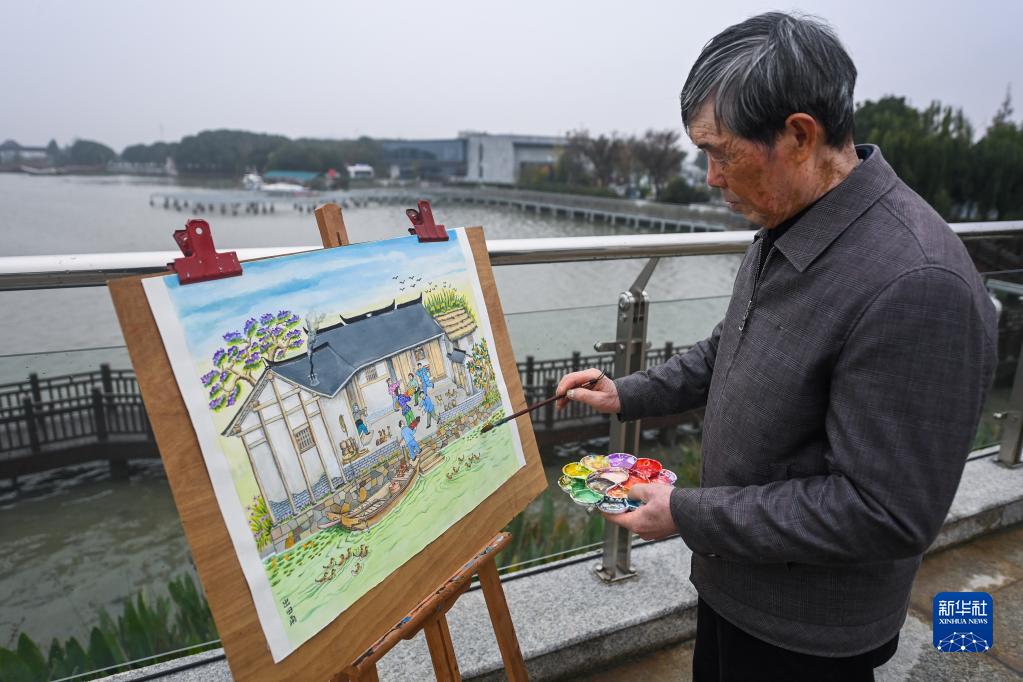 Ein Bauernkünstler malt an einem See im Dorf Linglongwan. (Foto vom 22. November, Xu Yu/Xinhua)