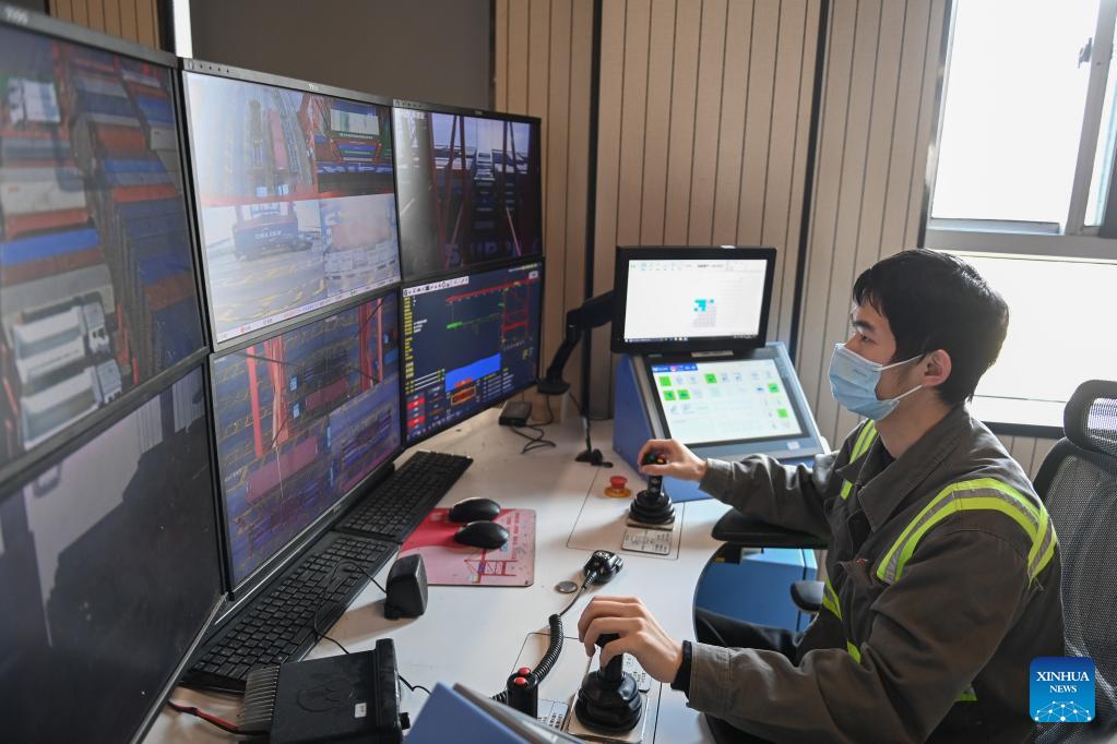 Ein Mitarbeiter kontrolliert die Verladung von Containern per Fernsteuerung. (Foto vom 13. Dezember, Huang Zongzhi/Xinhua)