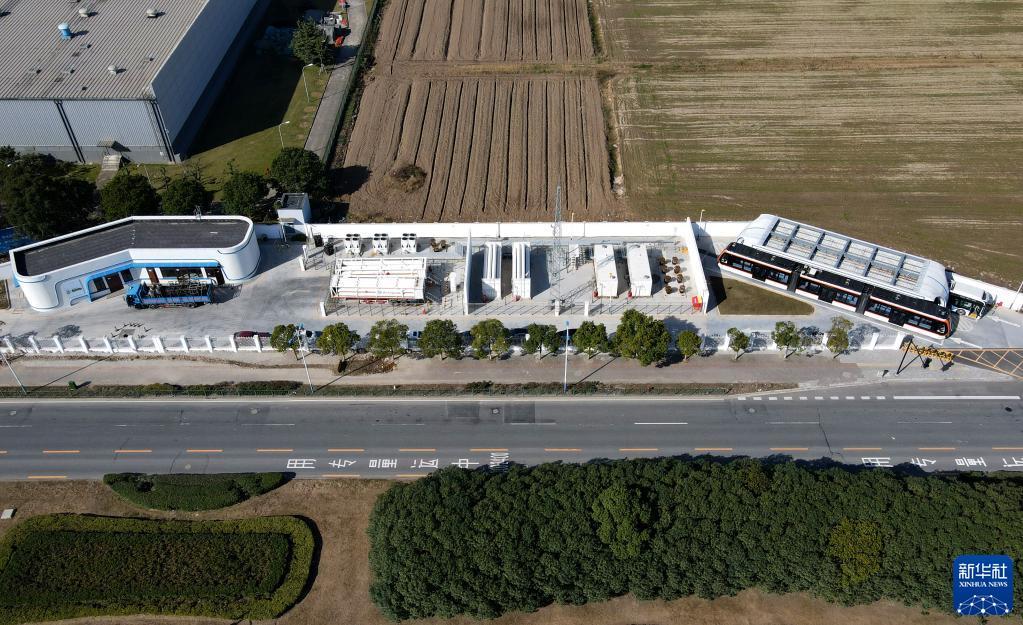 Eine Tankstelle für Wasserstoff-Brennstoffzellen-Fahrzeuge in Lingang, Shanghai. (Drohnenfoto vom 15. Dezember, Fang Zhe/Xinhua)