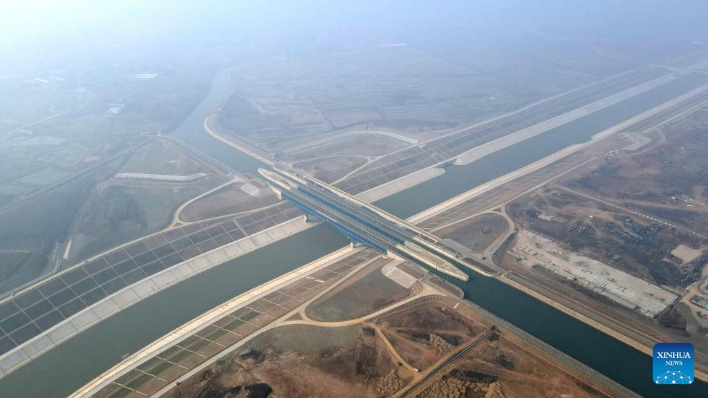 Diese Luftaufnahme zeigt ein Aquädukt des Pihe-Flusses über ein Mega-Wasserprojekt zur Umleitung von Wasser aus dem Jangtse-Fluss in den Huaihe-Fluss in der ostchinesischen Provinz Anhui. (Foto vom 30. Dezember, Xinhua/Liu Junxi)