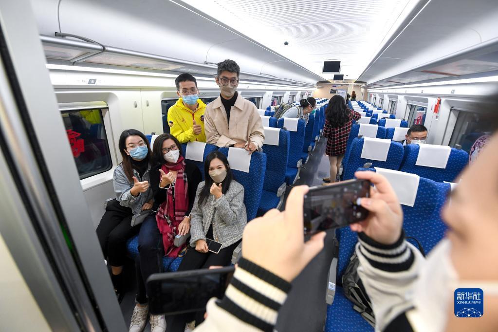 Am 15. Januar machen Passagiere auf Zug G5607, dem ersten Zug vom chinesischen Festland nach Hongkong nach der Wiederaufnahme des Verkehrs, ein Foto im Waggon am Nordbahnhof von Shenzhen. (Foto von Mao Siqian/Xinhua)