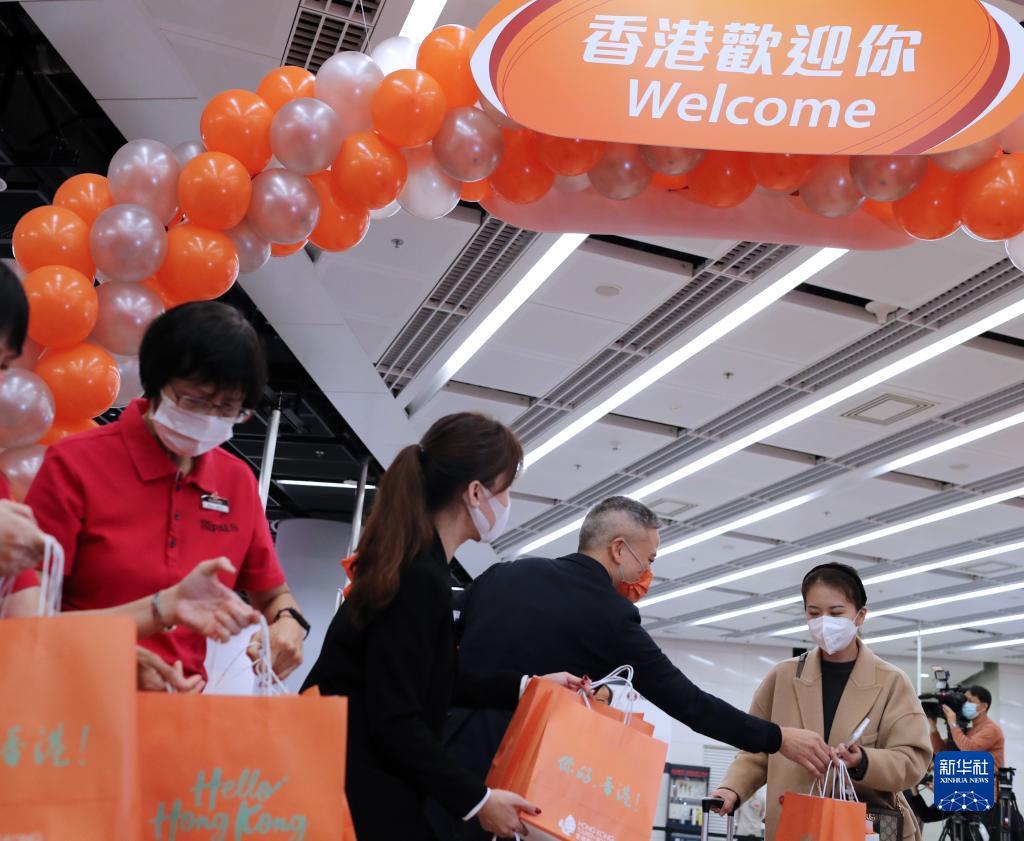 Mitarbeiter begrüßen am Bahnhof West Kowloon Hongkong Passagiere des Hochgeschwindigkeitszugs G5607, dem ersten nach der Wiederaufnahme des Verkehrs vom Festland nach Hongkong, und schenken ihnen Souvenirs. (Foto vom 15. Januar, Li Gang/Xinhua)