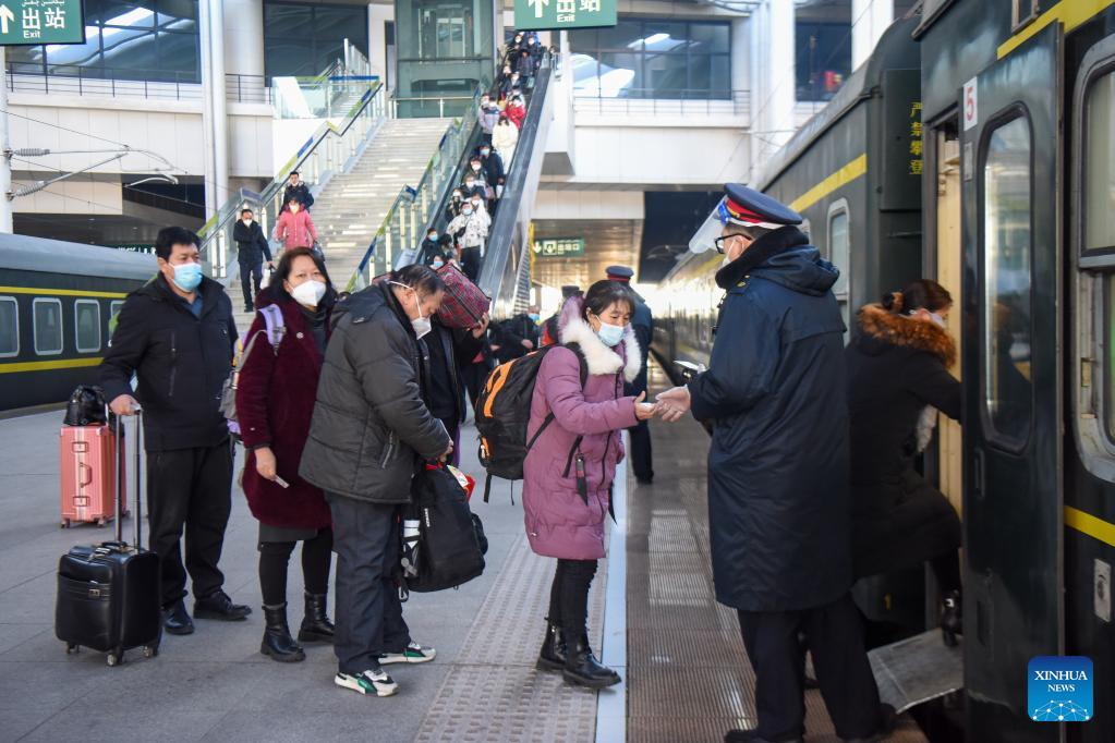 Passagiere zeigen ihre Tickets an der Fahrkartenkontrolle am Bahnhof Ürümqi im nordwestchinesischen Uigurischen Autonomen Gebiet Xinjiang, um den Zug zu besteigen. (Foto vom 27. Januar, Ding Lei/Xinhua)