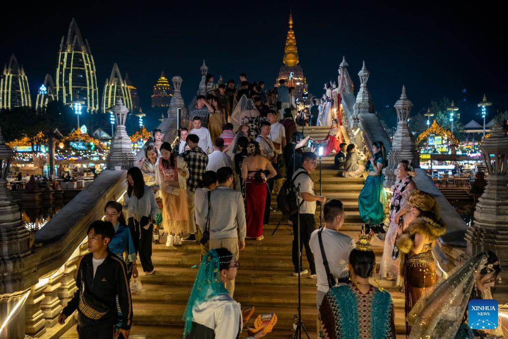Touristen auf einem Nachtmarkt in Xishuangbanna lassen Fotos von sich machen. (Foto vom 12. Februar 2023, Xinhua)
