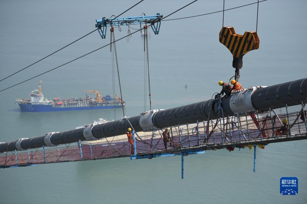 Arbeiter sind auf dem Laufsteg mit dem Anbringen von Hauptkabeln an der im Bau befindlichen Lingdingyang-Brücke beschäftigt. (Foto vom 22. Februar, Deng Hua/Xinhua)