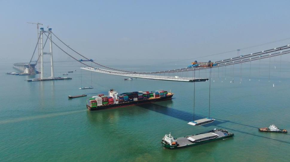 In diesen Tagen befindet sich der Bau der Lingdingyang-Brücke in der Phase des Einbaus der Stahlkästen in den Brückenbalken. Die Lingdingyang-Brücke ist ein wichtiger Teil der Shenzhen-Zhongshan-Passage in der südchinesischen Provinz Guangdong. In Bezug auf die Hauptspannweite stellt sie mit 1.666 Metern als die längste Übersee-Hängebrücke mit Stahlkastenträgern dar.