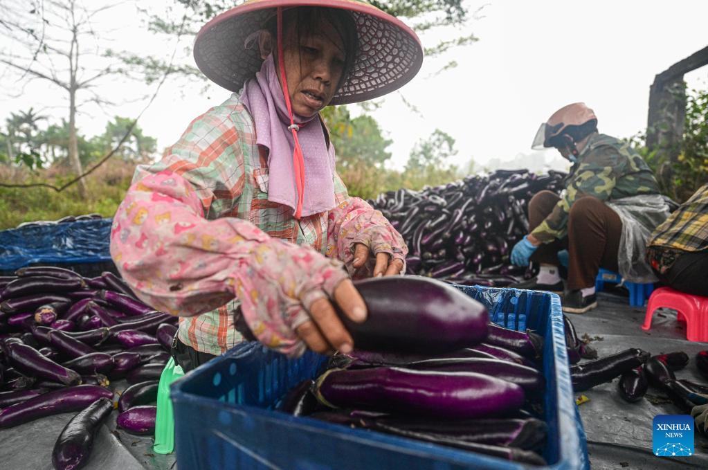Landwirte sortieren Auberginen in der Gemeinde Poxin im Kreis Tunchang in der südchinesischen Provinz Hainan. (Foto vom 24. Februar, Xinhua/Pu Xiaoxu)