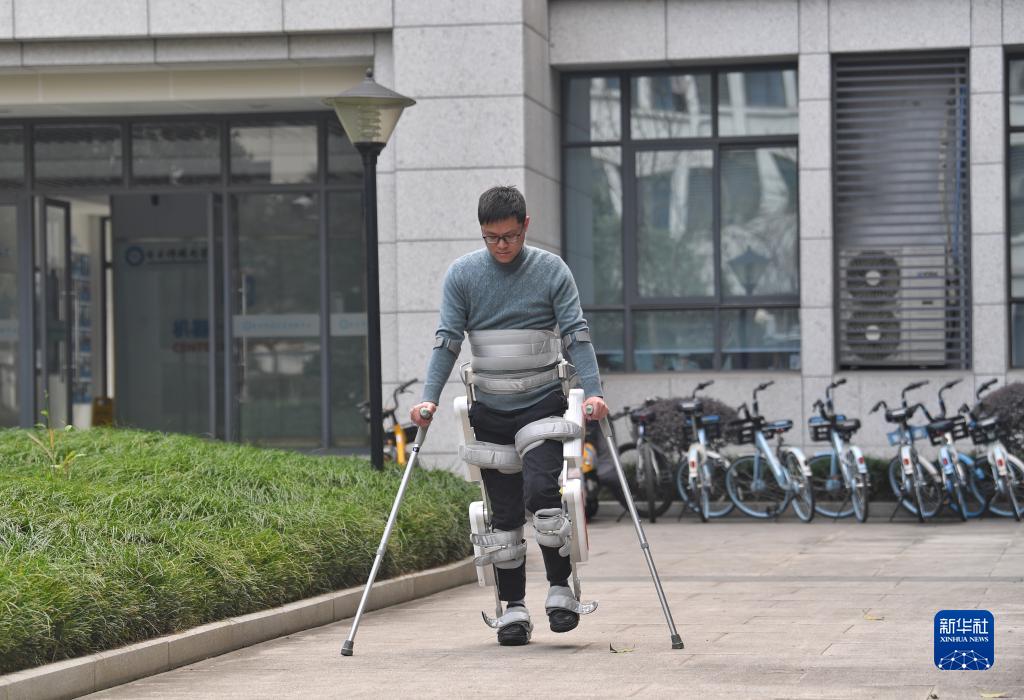 Ein Querschnittsgelähmter geht mit Hilfe eines Exoskelett-Roboters, der vom Robotik-Forschungszentrum der University of Electronic Science and Technology of China (UESTC) in Chengdu in der südwestchinesischen Provinz Sichuan entwickelt wurde. (Foto vom 6. März, Liu Kun/Xinhua)