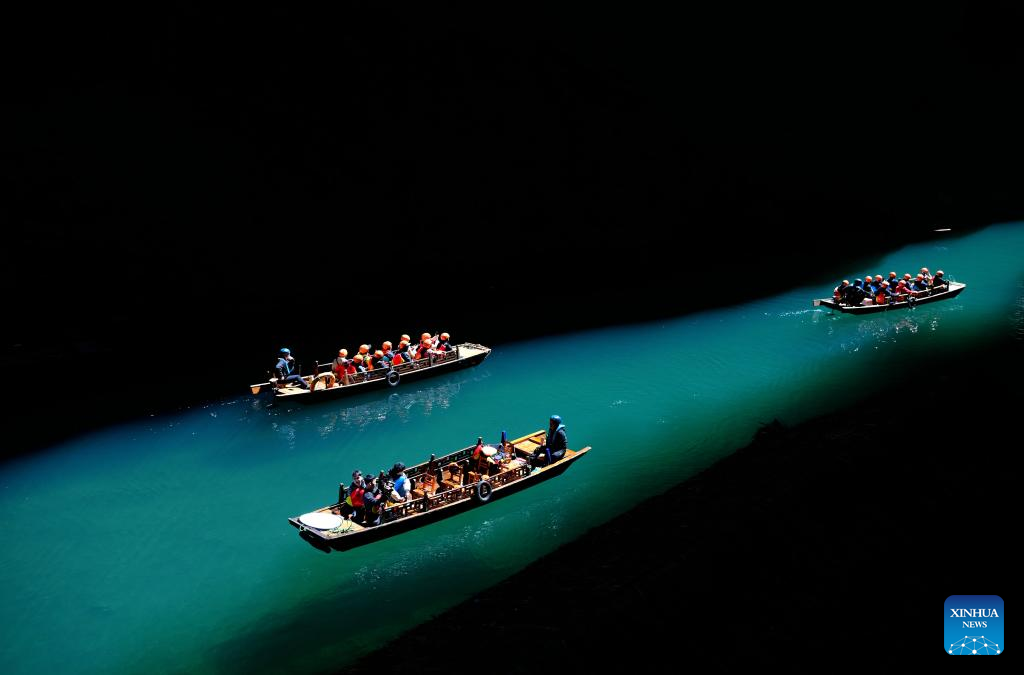 Das Luftbild zeigt eine Bootsfahrt in der Pingshan-Schlucht. (Foto vom 14. März 2023, Xinhua)