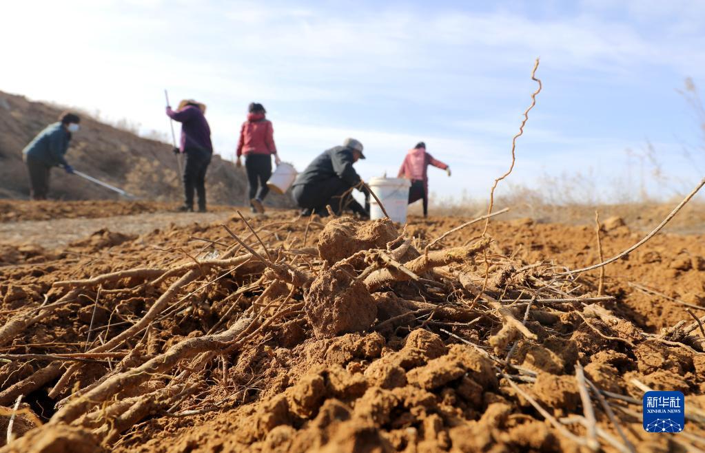 Bauern sammeln in der Pflanzbasis für Traditionelle Chinesische Medizin in der Gemeinde Yanzhuang des Bezirks Xingtang in der Stadt Shijiazhuang in der Provinz Hebei „Huang Qi“, eine Art Heilkraut mit dem wissenschaftlichen Namen Scutellaria baicalensisGeorgi. (Foto vom 15. März, Luo Xuefeng/Xinhua)