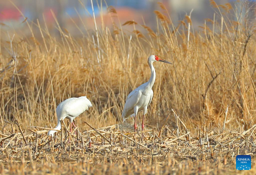 Dieses Foto vom 15. März 2023 zeigt weiße Kraniche im Huanzidong-Feuchtgebiet.