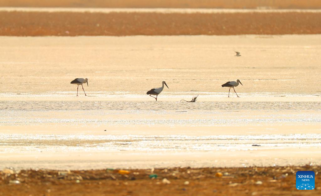 Dieses Foto vom 15. März 2023 zeigt Schwarzschnabelstörche im Huanzidong-Feuchtgebiet.