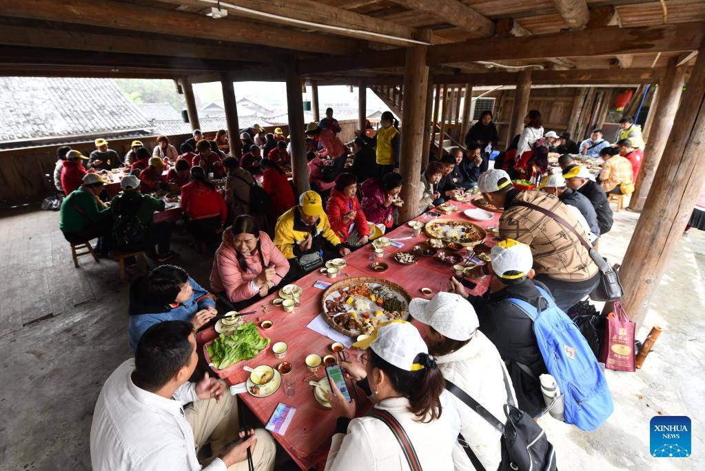 Touristen aus der Stadt Zhanjiang probieren in Rongshui typische lokale Speisen. (Xinhua, 19. März 2023)