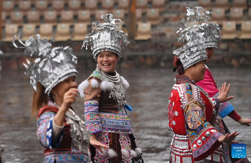 Touristen lernen, in ethnischen Kostümen gekleidet, lokale Lieder und Tänze. (Xinhua, 19. März 2023)