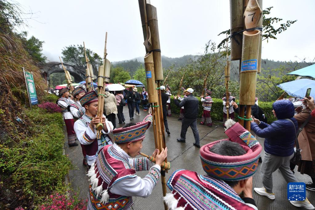 Menschen der ethnischen Gruppe der Miao begrüßen Touristen in Rongshui mit typischen lokalen Tänzen und Gesängen. (Xinhua, 19. März 2023)
