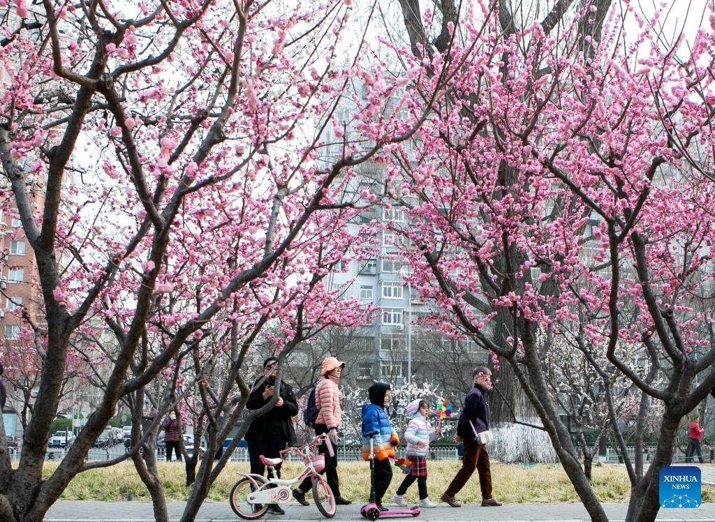 Menschen betrachten blühende Blumen. (Xinhua, 19. März 2023)