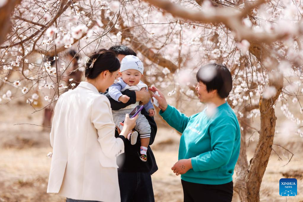 Eine Familie besucht ein Aprikosenblütenfest im Landkreis Toksun in der Stadt Turpan im nordwestchinesischen Uigurischen Autonomen Gebiet Xinjiang. Am Samstag startete hier das Turpaner Aprikosenfest. (Foto vom 18. März, Xinhua/Hao Zhao)