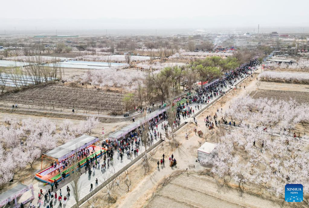 Dieses Luftbild zeigt Menschen, die das Aprikosenblütenfest im Bezirk Toksun der Stadt Turpan besuchen. (Foto vom 18. März, Xinhua/Hao Zhao)