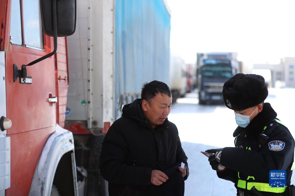Ein Grenzpolizist überprüft die Dokumente eines LKW-Fahrers am Autobahn-Grenzübergang Manzhouli. (Foto vom 15. März, Wang Kaiyan/Xinhua)