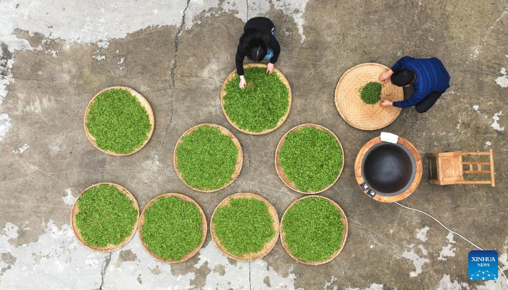 Teehersteller rösten die Teeblätter. (Foto vom 20. März 2023, Xinhua)