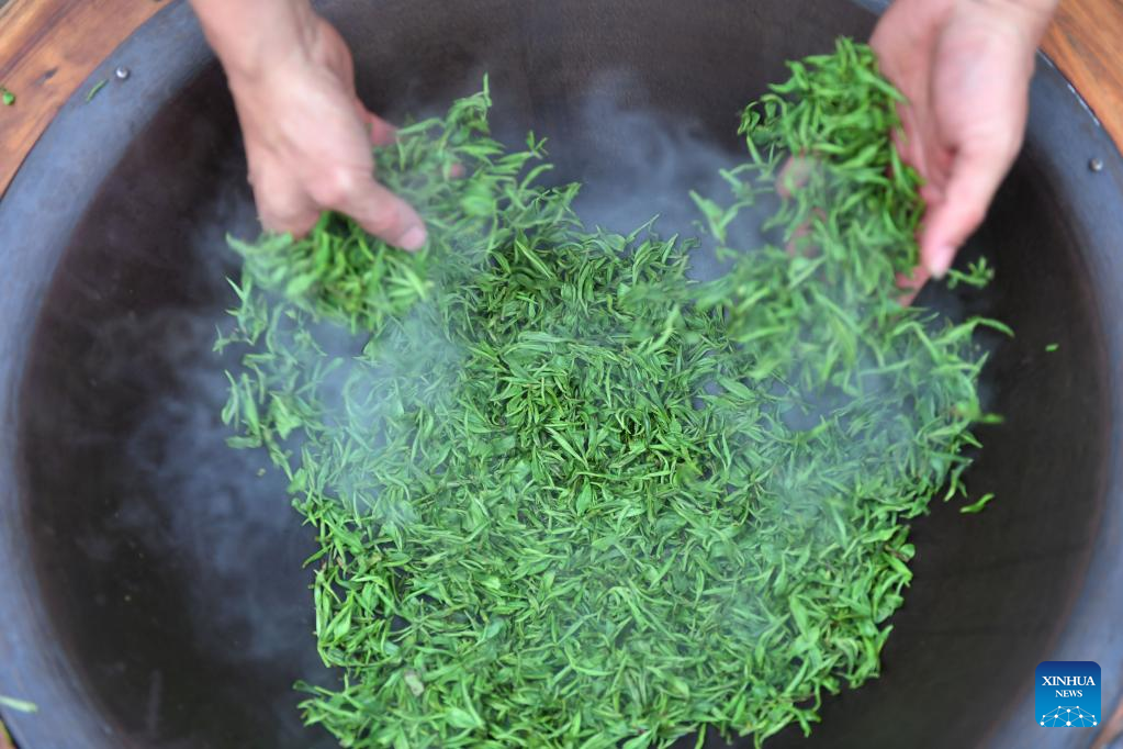 Teehersteller rösten die Teeblätter. (Foto vom 20. März 2023, Xinhua)