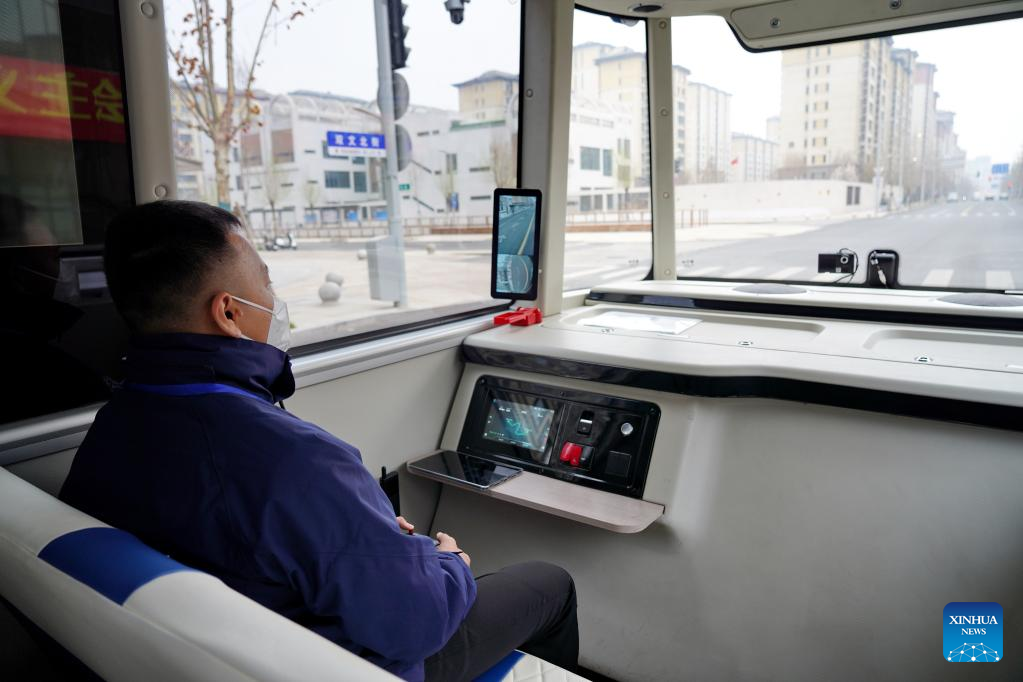Ein Sicherheitsbeauftragter sitzt in dem intelligenten vernetzten Bus. (Foto vom 20. März 2023, Xinhua)