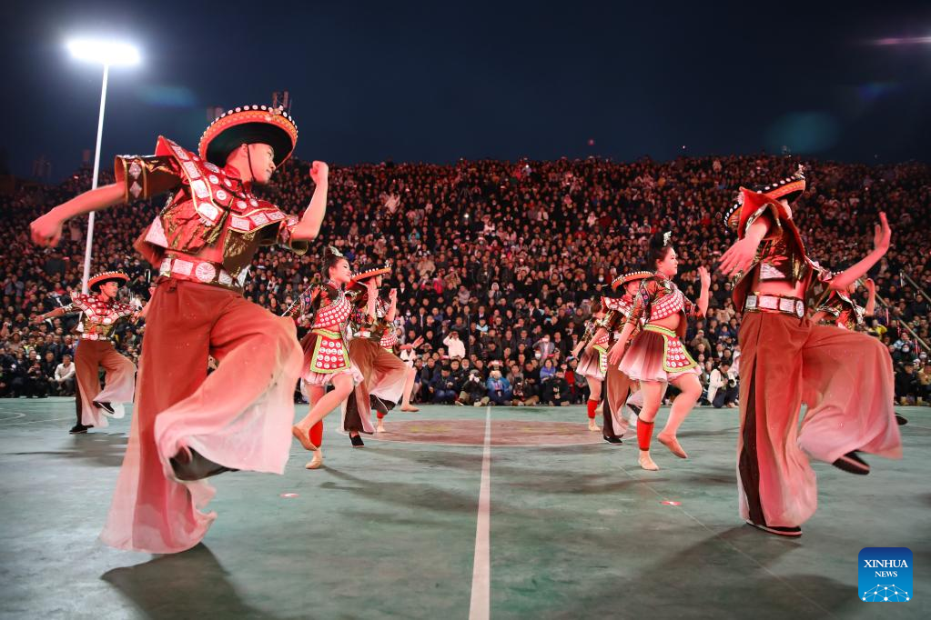 Lokale Menschen tanzen im Stil der Miao-Nationalität vor einem Basketballspiel im Dorf Taipan. (Foto vom 25. März, Liu Xu/Xinhua)