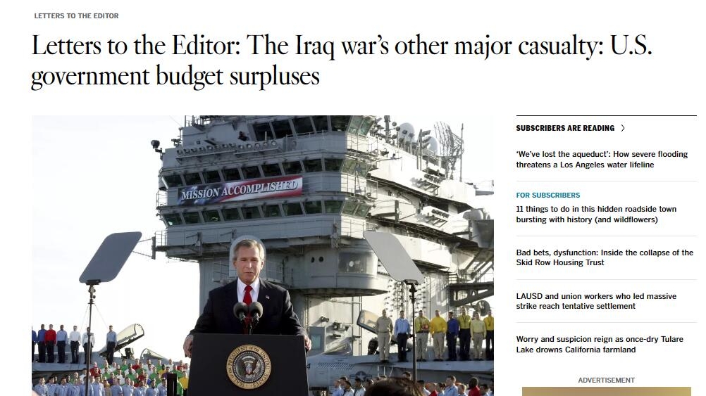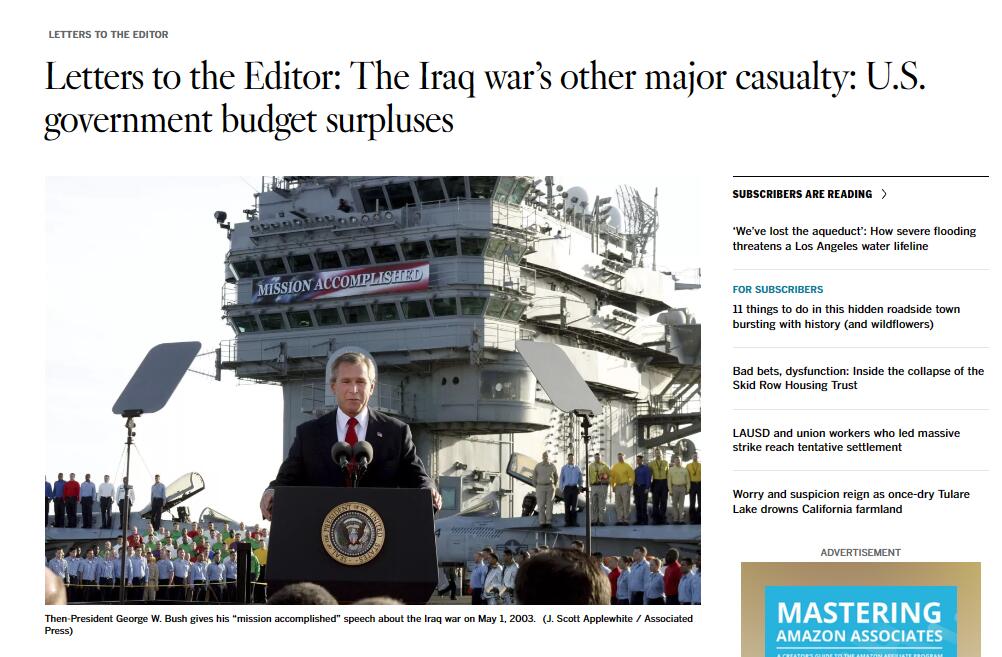 Am 23. März berichtete die Los Angeles Times, dass der von den USA im Jahr 2003 gestartete Irak-Krieg nicht nur viele Opfer verursacht habe, sondern auch einen großen Teil des frühen Haushaltsüberschusses der Vereinigten Staaten verschwendet habe. Dies habe wiederum zu einem erheblichen Anstieg der US-Staatsanleihen geführt und die Regierung musste die Schuldenobergrenze wiederholt erhöhen. Dadurch seien die USA in eine Art „Schuldenwirbel“ gefallen.