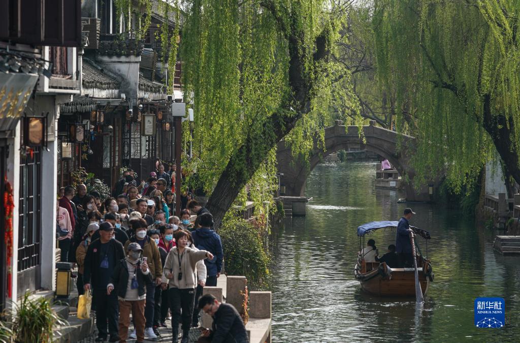 Touristen machen einen Rundgang durch die Gassen in der historischen Stadt Zhouzhuang. (Foto vom 28. März, Yang Lei/Xinhua)