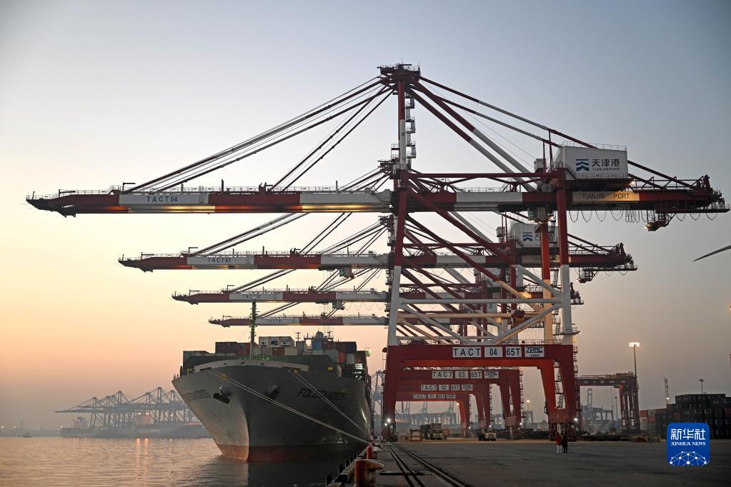 Ein Containerschiff wird am internationalen Containerterminal des Hafens in Tianjin entladen. (Foto vom 11. April, Zhao Zishuo/Xinhua)