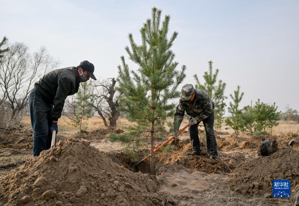 Arbeiter pflanzen Bäume in der Horqin-Wüste in Tongliao in der nordchinesischen Autonomen Region der Inneren Mongolei. (Foto von Lian Zhen/Xinhua)