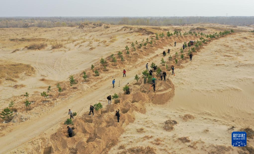 Arbeiter pflanzen Bäume in der Horqin-Wüste in Tongliao in der nordchinesischen Autonomen Region der Inneren Mongolei. (Drohnenfoto von Lian Zhen/Xinhua)