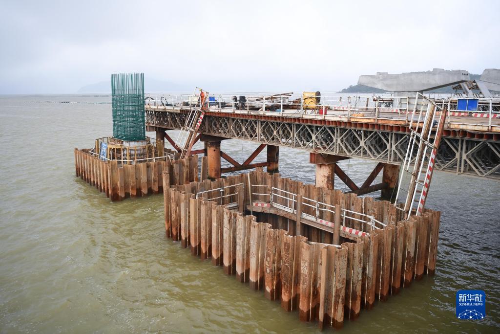 Arbeiter sind auf der Huangmaohai-Brücke mit dem Bau von Pfeilern beschäftigt. (Foto vom 18. April, Deng Hua/Xinhua)