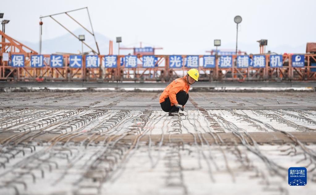 Ein Bauarbeiter verlegt auf der Huangmaohai-Brücke die Bewehrungsstähle. (Foto vom 18. April, Deng Hua/Xinhua)