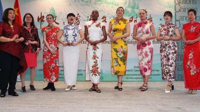 In Cheongsams (oder Qipao) gekleidete Schauspielerinnen singen chinesische und französische Lieder während der Feierlichkeiten zum Tag der chinesischen Sprache der Vereinten Nationen am 18. April im UNESCO-Hauptquartier in Paris.