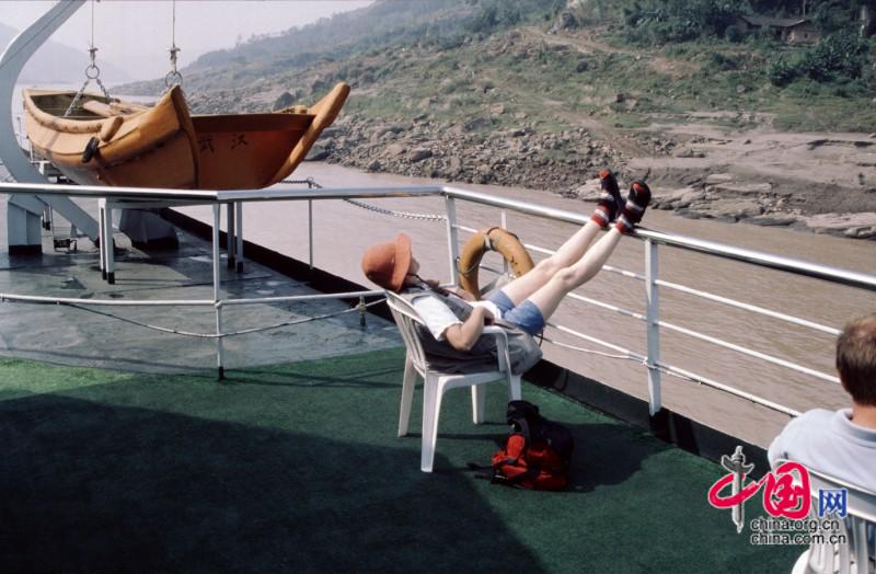 Jeden Morgen wurden wir durch den Lautsprecher geweckt. Wer Lust hatte, trank schon vorab einen Morgentee. Ich nicht, denn ich traf mich auf dem Deck mit einigen Leuten vom Personal. Sie machten ihre Morgengymnastik, ich auch. Danach ging ich zum Frühstück. Um 10.00 Uhr waren wir schon in Fengdu. Motorräder wurden im Fluss gewachsen. Und ich rannte auf den Berg, vorbei an der 175-Meter-Grenze. Bis dahin wird das Wasser steigen und alles unter sich begraben. Die Hochhäuser und andere Bauten wurden gesprengt, damit sie die Schifffahrt nicht behindern.