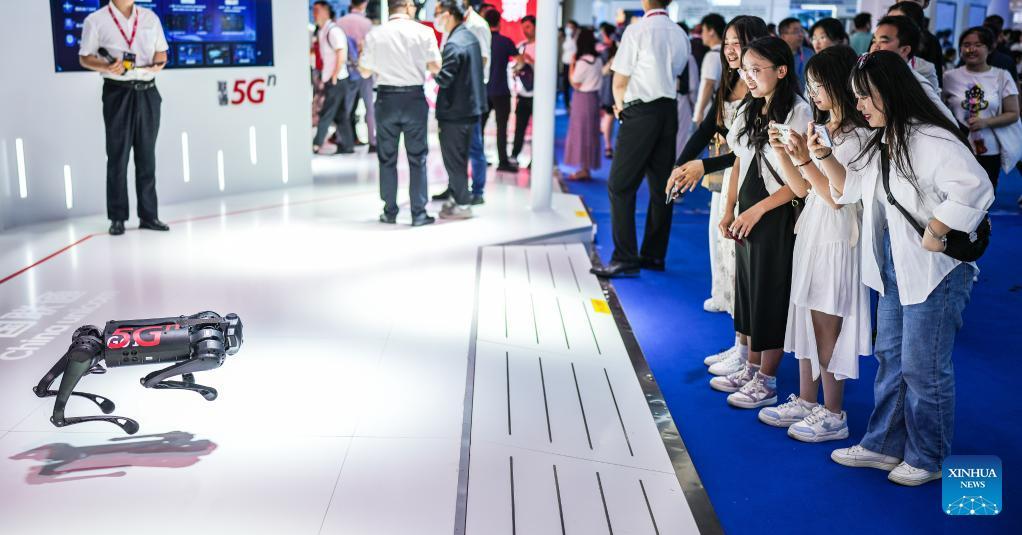 Besucher interagieren mit einem Roboterhund. (Foto: Xinhua/ Tao Liang)