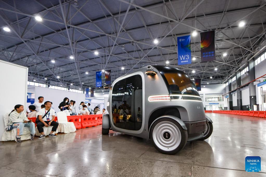 Besucher erleben das selbstfahrende Fahrzeug Robobus. (Foto: Xinhua/ Ou Dongqu)