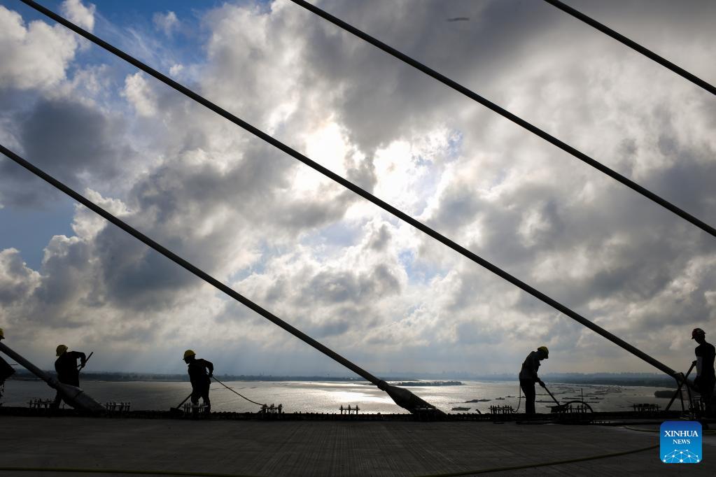 Bauarbeiter bauen am 25. Mai 2023das Deck der großen Luzhou-Brücke in der Stadt Zhanjiang in der südchinesischen Provinz Guangdong. (Xinhua/Mao Siqian)