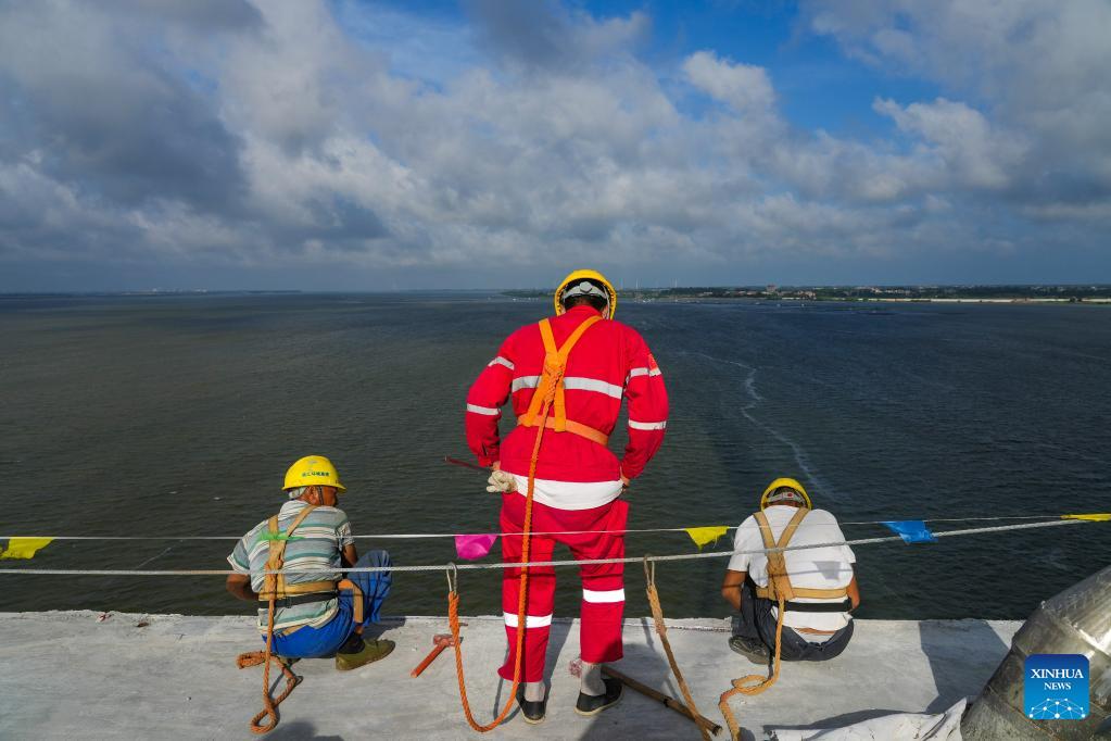 Arbeiter bereiten sich am 25. Mai 2023 auf die Installation eines Geländers auf der großen Luzhou-Brücke in der Stadt Zhanjiang in der südchinesischen Provinz Guangdong vor. (Xinhua/Liu Dawei)