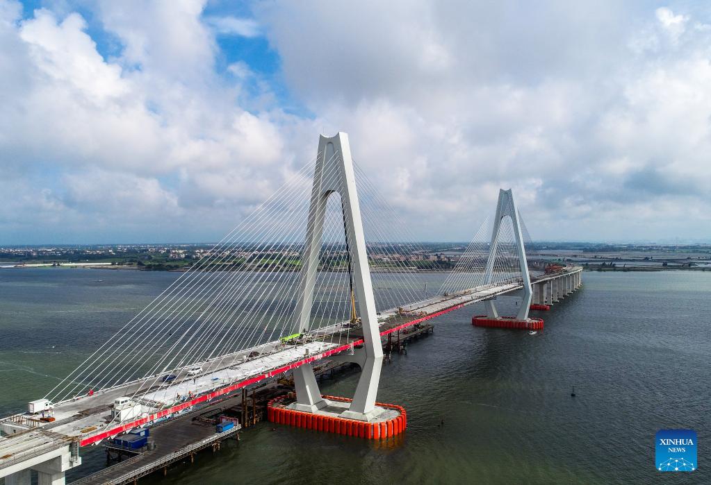 Diese Luftaufnahme vom 25. Mai 2023 zeigt die im Bau befindliche große Luzhou-Brücke in der Stadt Zhanjiang in der südchinesischen Provinz Guangdong. (Xinhua/Liu Dawei)