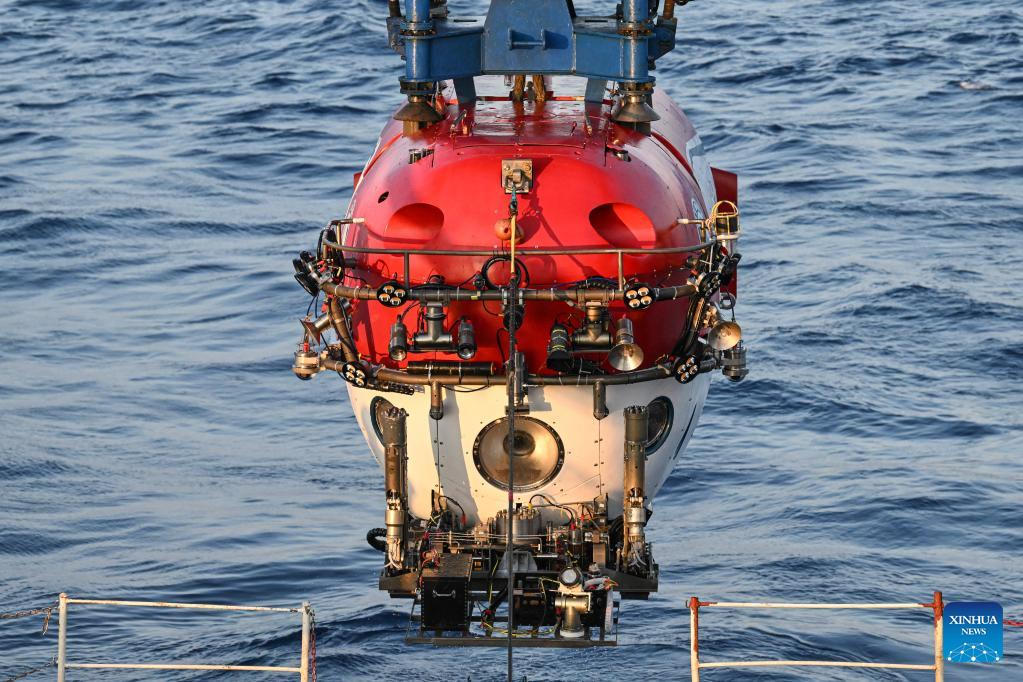 Das bemannte Tauchboot „Shenhai Yongshi“ wird am 24. Mai 2023 vom Forschungsschiff Tansuo-1 abgelassen und bereitet sich auf das Abtauchen vor, um Unterwasseruntersuchungen im Südchinesischen Meer durchzuführen. (Xinhua/Pu Xiaoxu)