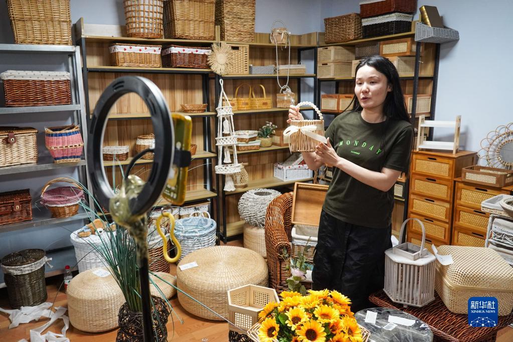 Eine Mitarbeiterin verkauft Weidenwebereiprodukte per Livestreaming. (Foto vom 6. Juni 2023, Xinhua)