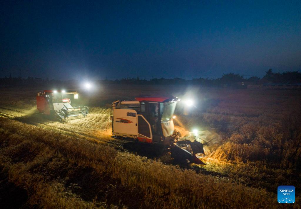 Dorfbewohner fahren Maschinen zur Weizenernte im Dorf Zhaizhuang im Bezirk Jiangyan der Stadt Taizhou in der ostchinesischen Provinz Jiangsu. (Foto vom 6. Juni, Tang Dehong/Xinhua)