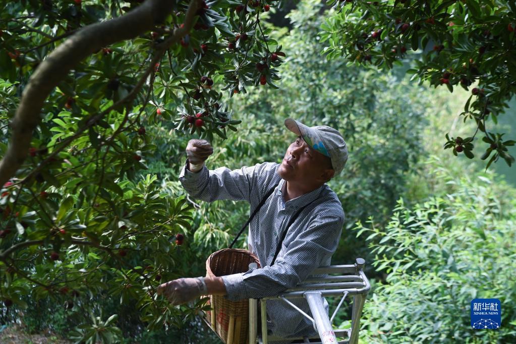 Ein Mann pflückt die Pappelpflaumen. (Foto vom 12. Juni, Xu Yi/Xinhua)