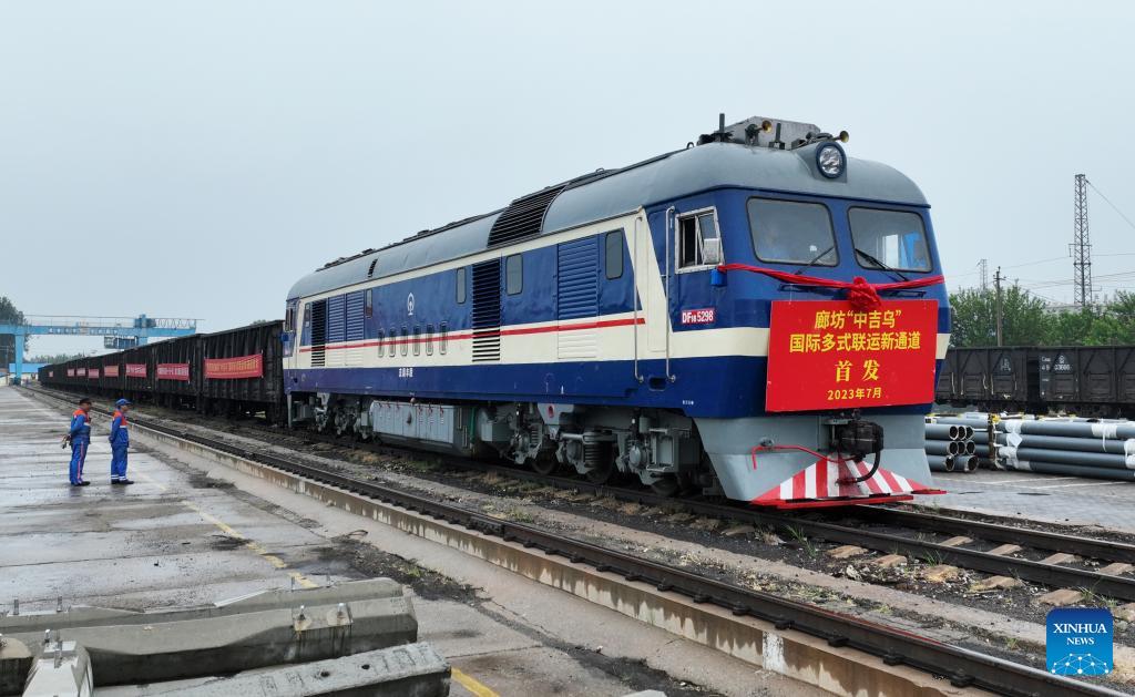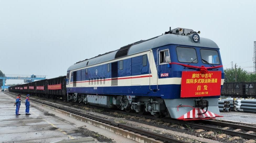 Dieses Foto zeigt den ersten Zug einer neuen internationalen multimodalen Transportroute, der am 4. Juli 2023 in der Stadt Langfang in der nordchinesischen Provinz Hebei abfährt. (Foto von Jia Jun/Xinhua)