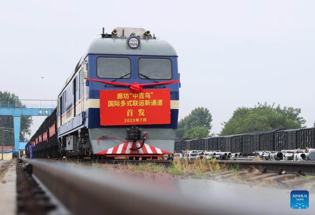 Dieses Foto zeigt den ersten Zug einer neuen internationalen multimodalen Transportroute, der am 4. Juli 2023 in der Stadt Langfang in der nordchinesischen Provinz Hebei abfährt. (Foto von Jia Jun/Xinhua)