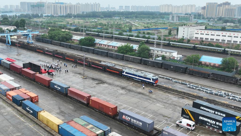 Dieses Foto zeigt den ersten Zug einer neuen internationalen multimodalen Transportroute, der am 4. Juli 2023 in der Stadt Langfang in der nordchinesischen Provinz Hebei abfährt. (Foto von Jia Jun/Xinhua)