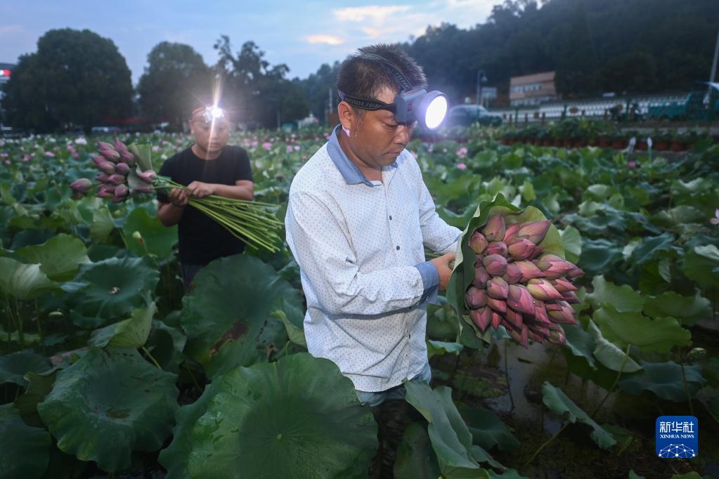 Am frühen Morgen pflücken Dorfbewohner der Gemeinde Daciyan in der Stadt Jiande in der ostchinesischen Provinz Zhejiang Lotusblumen und Samenkapseln der Lotusblüte, die anschließend schnell zu Blumenmärkten in den Provinzen Jiangsu, Zhejiang und Shanghai transportiert werden. (Foto vom 6. Juli 2023, Xinhua)